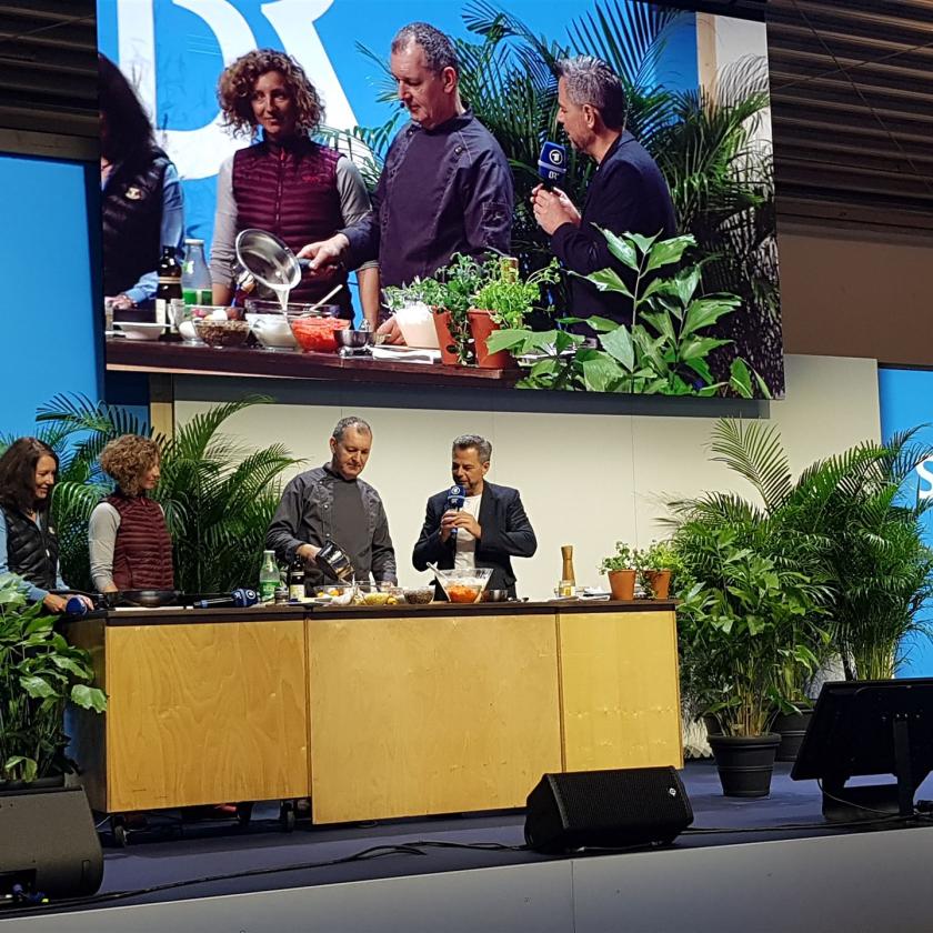 Ein Teil der "Wir-in-Bayern"-Familie des BR auf der Messe München: v.l Reiseexpertin Annette Eckl, Wanderexpertin Nina Schlesener, Spitzenkoch Alfred Fahr, Moderator Michael Sporer