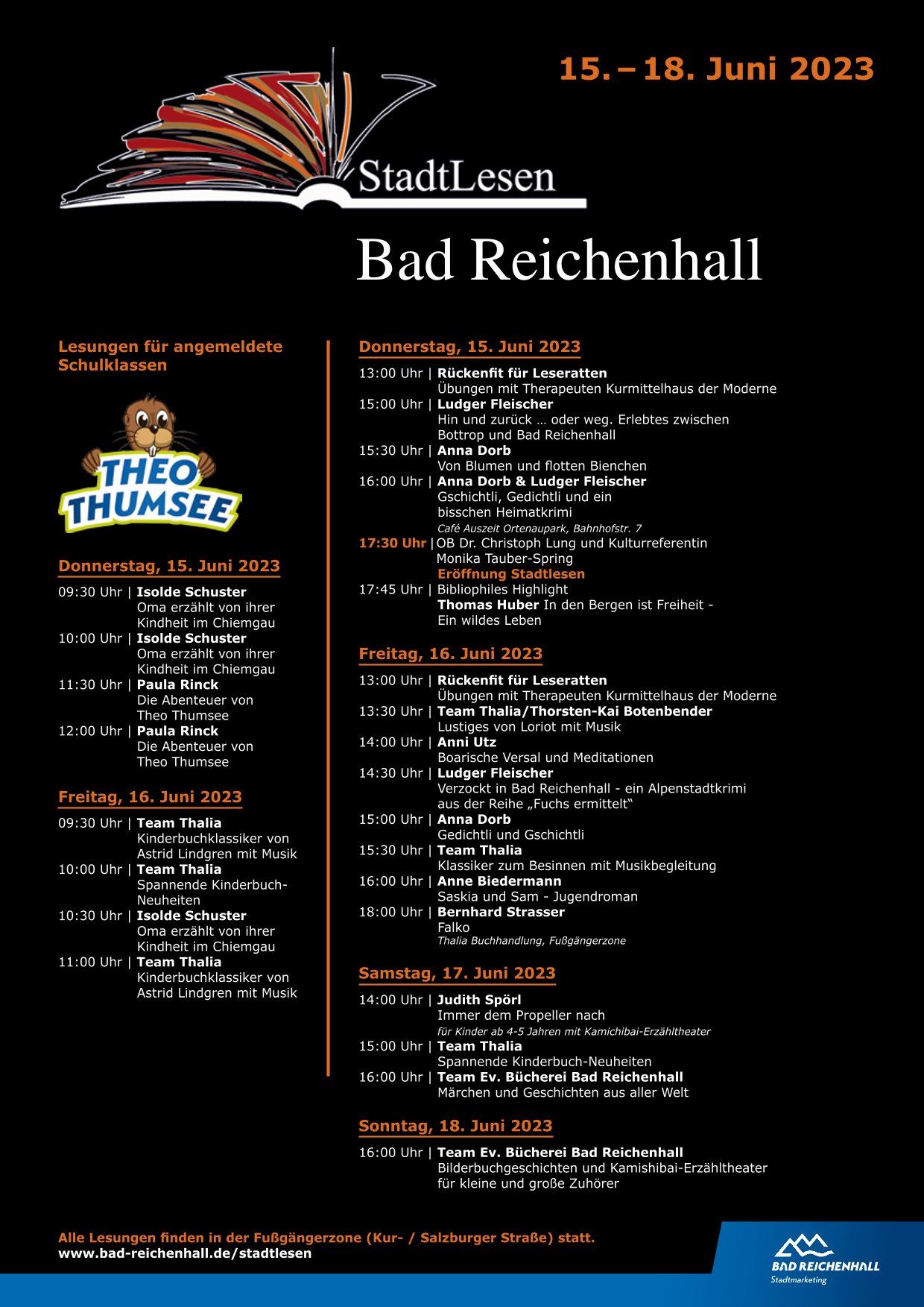 Am 15. und 16. Juni 2023 habe ich im Rahmen des Stadtlesens in Bad Reichenhall in der Innenstadt auf der Bühne und im Café Auszeit gemeinsam mit Lokalautorin Anna Dorb Ausschnitte aus dem Krimi und aus meinem Kurzgeschichtenbuch "Hin und zurück ... oder weg" gelesen.